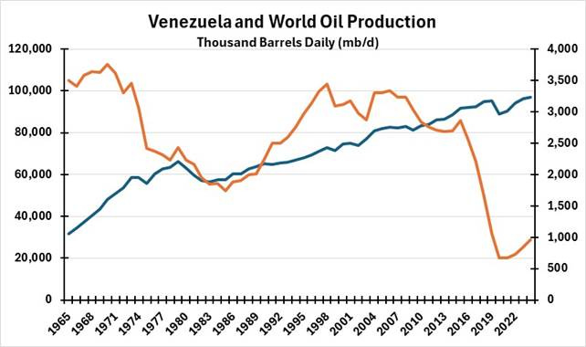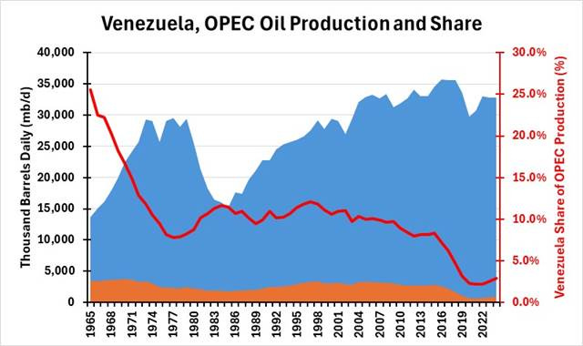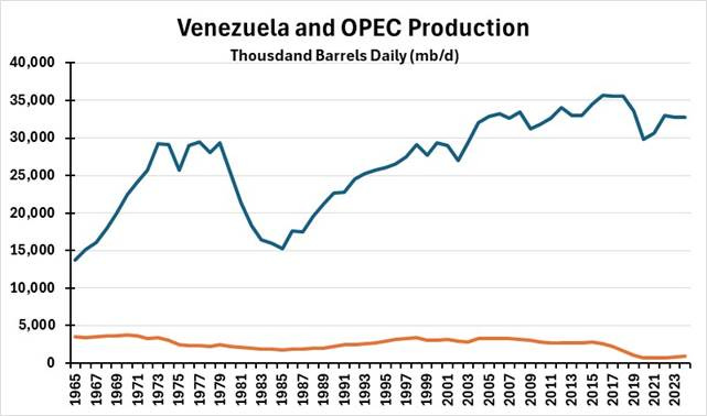 For readers who prefer more granular oil production data, the following two charts show Venezuela’s output relative to the world oil supply and OPEC’s output. The challenges of sustaining and growing its oil production reflected the dynamics of Venezuela’s political situation and the tactics of its national oil company, Petróleos de Venezuela (PDVSA).